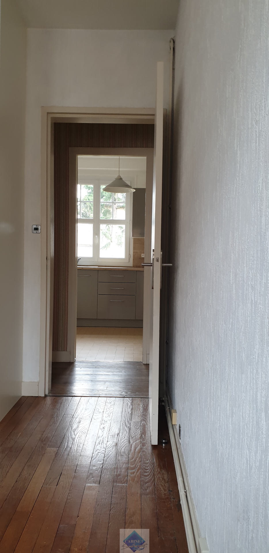 Appartement 1er étage F2 en centre ville comprenant une entrée avec penderie, une cuisine aménagée et semi équipée, un séjour salon, une chambre. Une salle de bains, wc séparé Une cave Chauffage gaz de ville