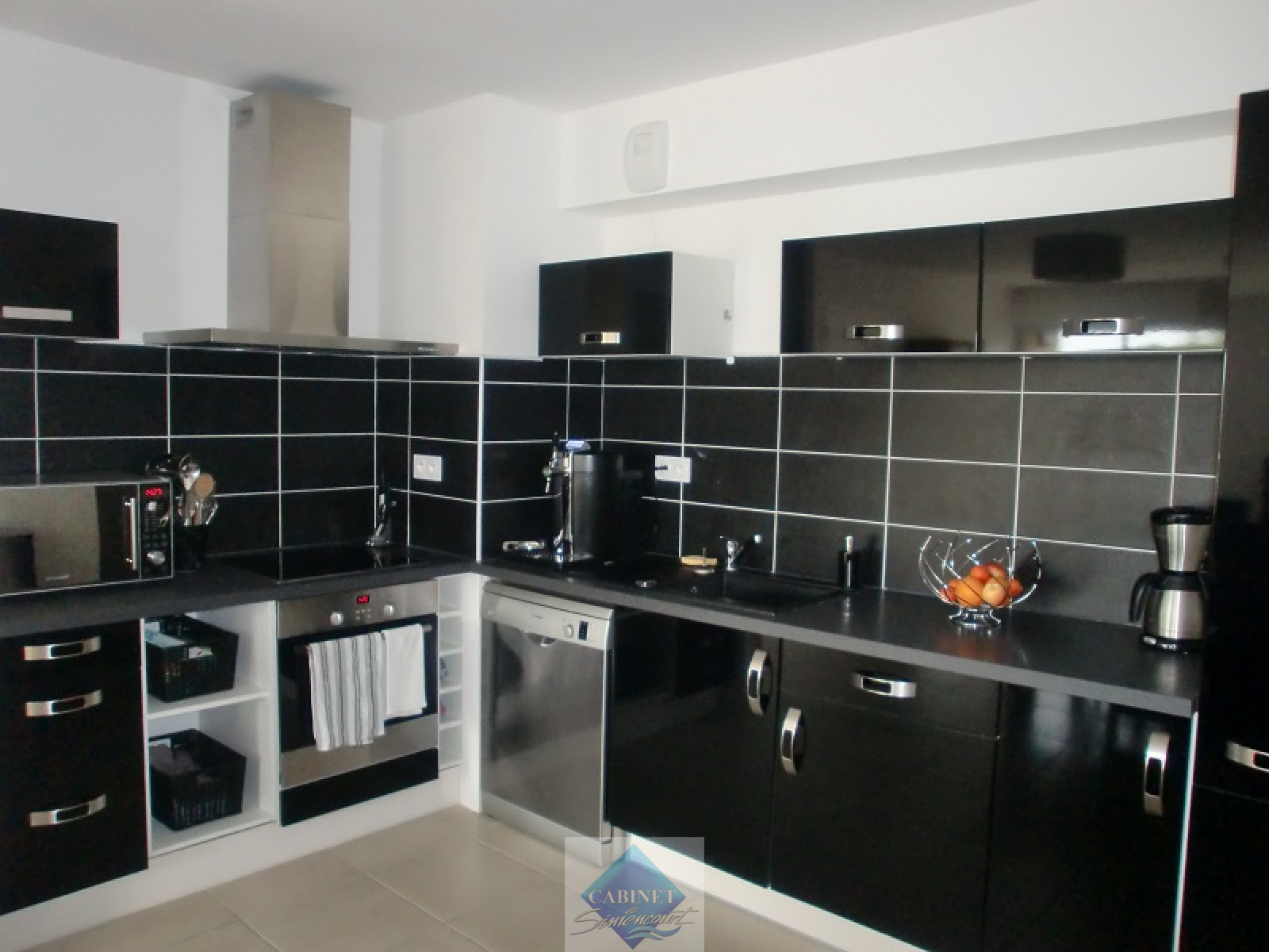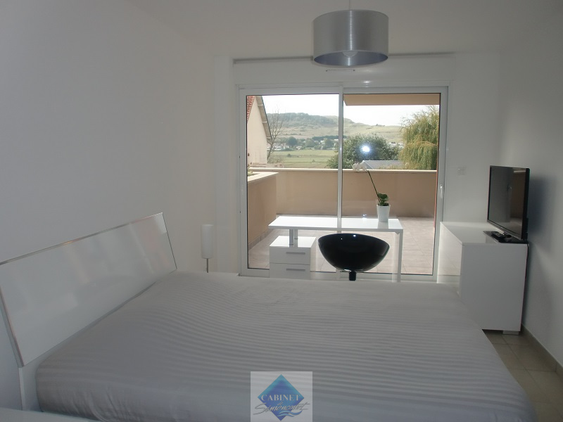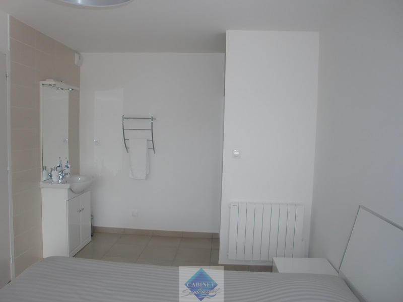 Appartement vue mer, au 1er étage, comprenant une entrée avec placard, un séjour coin cuisine équipée et aménagée, une salle de douche, un wc, une chambre avec placard, une chambre avec douche et meuble vasque, chauffage électrique, terrasse, cave et place de parking. Libre de suite. Les frais d'agence sont de 450 €. Plus de renseignements au 06.80.98.18.25
