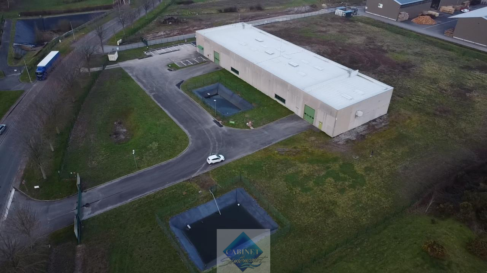 Ossature et façades béton. Deux grandes portes sectionnelles de plain-pied situées aux nord-ouest et sud-ouest du bâtiment permettent un accès pour le chargement/déchargement des camions.