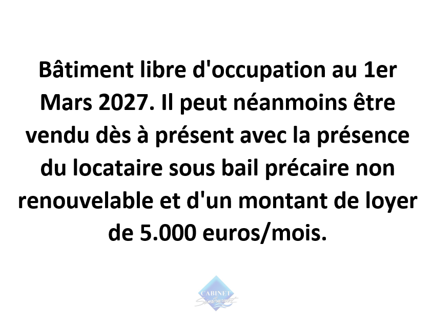 Bâtiment libre d'occupation au 1er Mars 2027. Il peut néanmoins être vendu dès à présent avec la présence du locataire sous bail précaire non renouvelable et d'un montant de loyer de 5.000 euros/mois.