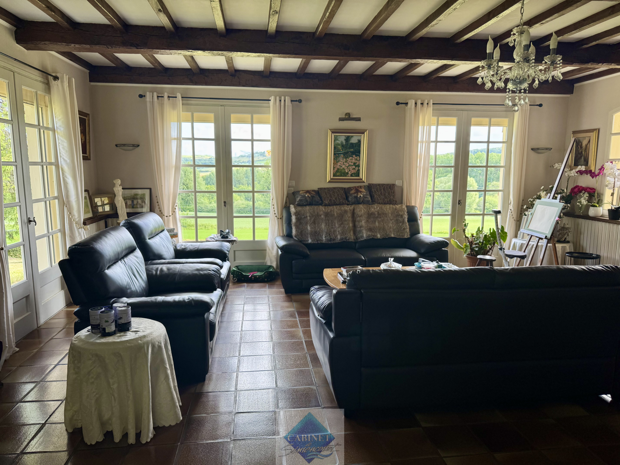 - d'un espace salon/ salle à manger de près de 50m2 avec une vue sur la vallée et le jardin et une cheminée fonctionnelle