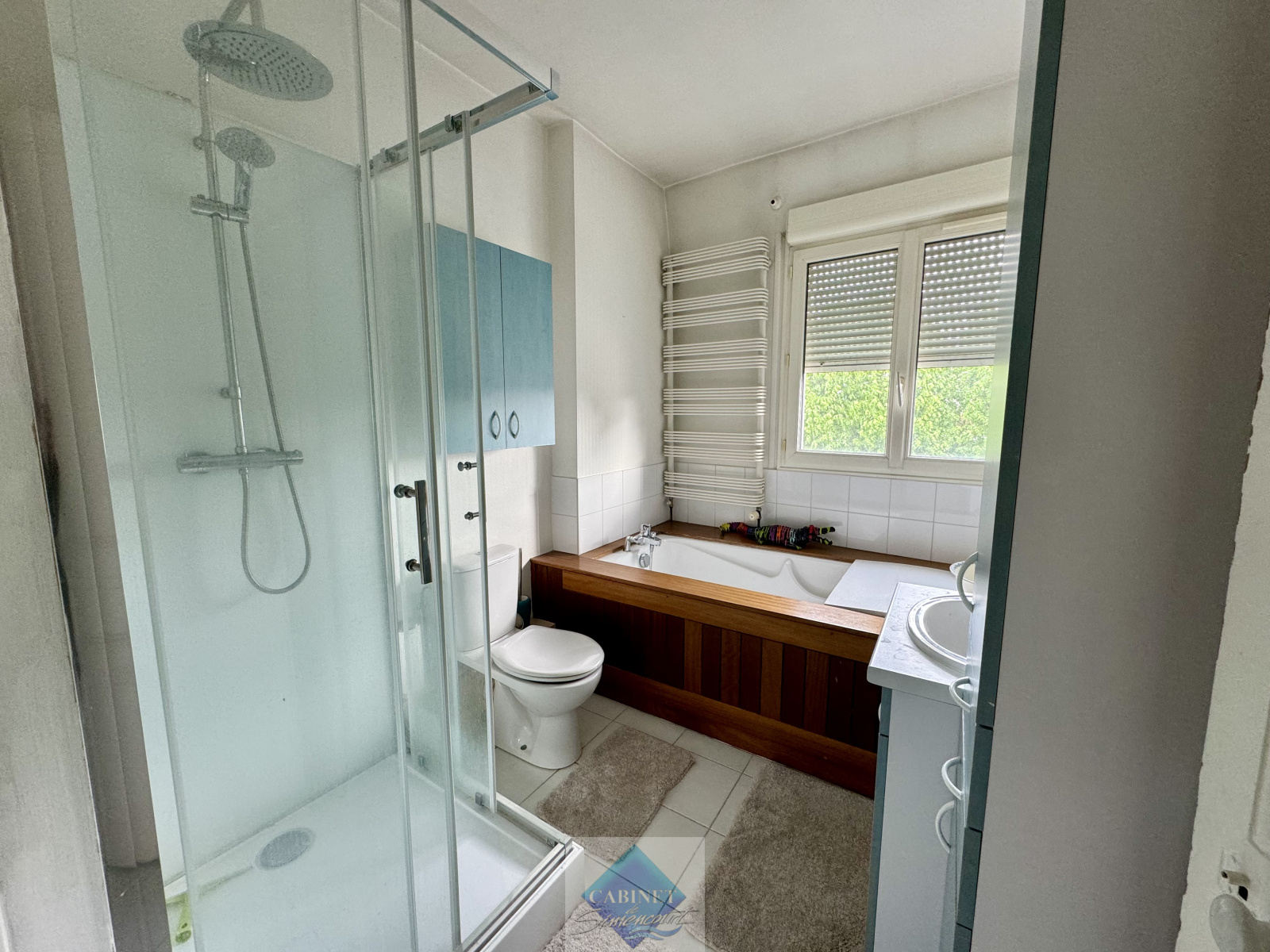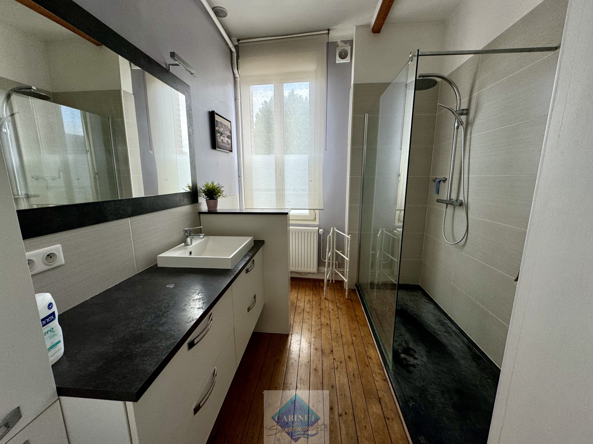 - Au rez-de-chaussée : une chambre, une cuisine/ bar, une salle d’eau avec toilettes
