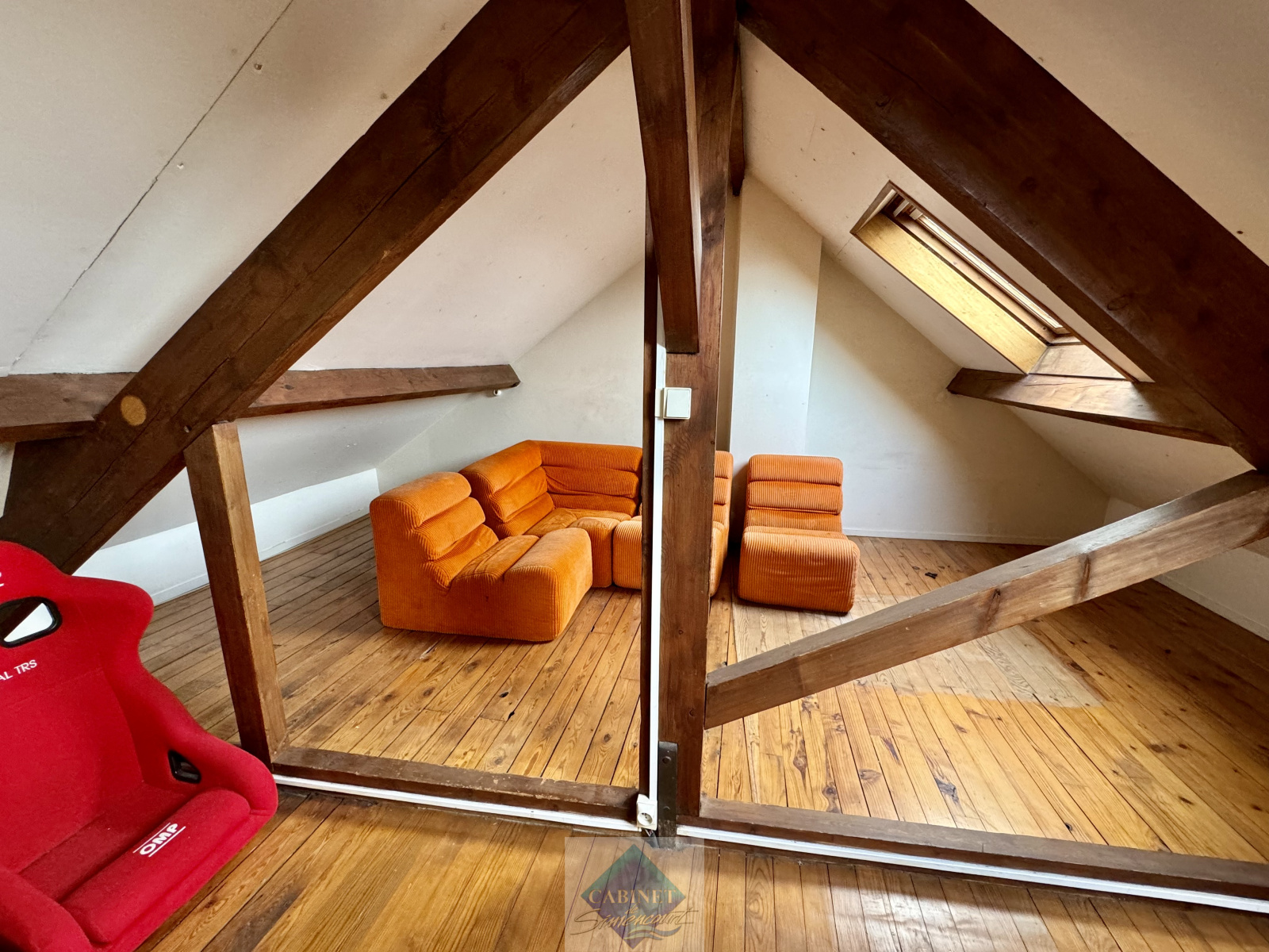 - A l’étage : grande pièce avec chauffage électrique et poêle à bois